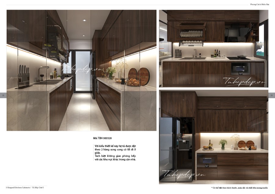 Tách biệt không gian bếp với các không gian khác của ngôi nhà, phòng bếp thiết kế thời thượng kiểu song song với hệ thống tủ bếp hiện đại