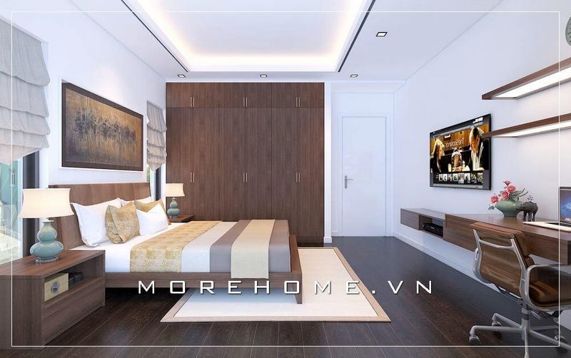 Mẫu nội thất phòng ngủ chung cư hiện đại được bố trí hài hòa, với 2 gam màu chủ đạo nâu - trắng, tạo nên hiệu ứng thanh thoát và trầm ấm cho cả không gian