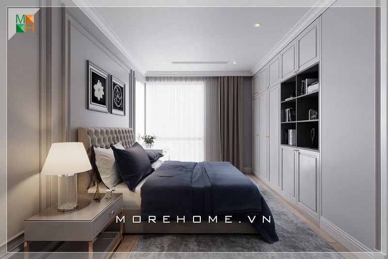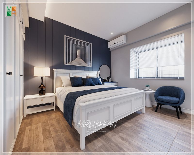 Mẫu thiết kế nội thất phòng ngủ chung cư Mandarin tân cổ điển với sắc xanh nhẹ nhàng kết hợp nội thất hợp lí tạo nên một căn phòng ngủ lí tưởng.