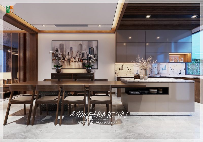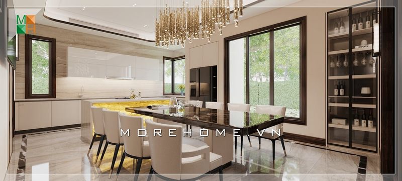 Cùng ngắm nhìn mẫu thiết kế không gian bếp liền bàn ăn sang trọng phù hợp cho không gian nhà chung cư, biệt thự, nhà phố đẳng cấp.