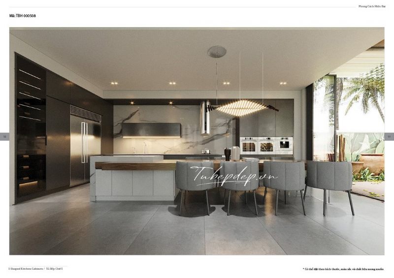 Thiết kế kệ tủ bếp chữ I bằng gỗ công nghiệp tông màu ghi xám mang lại cho không gian phòng bếp sự sang trọng, cao cấp và không bao giờ lỗi mốt