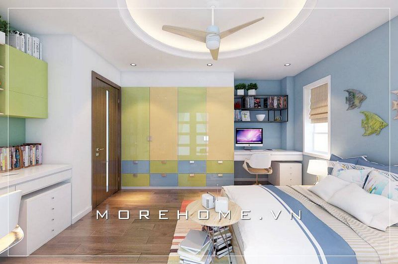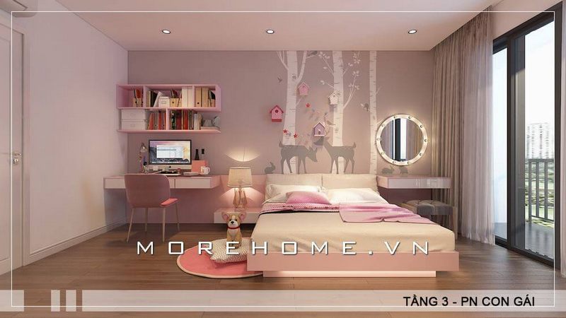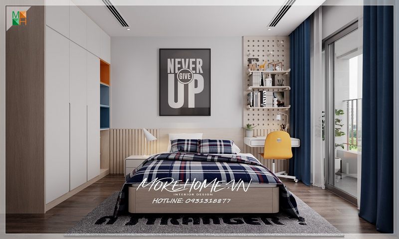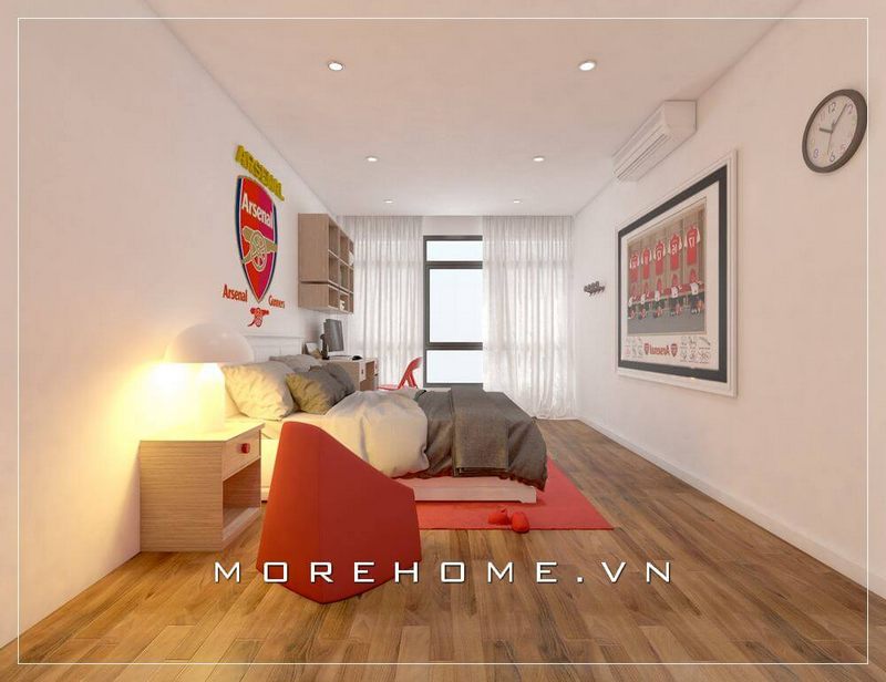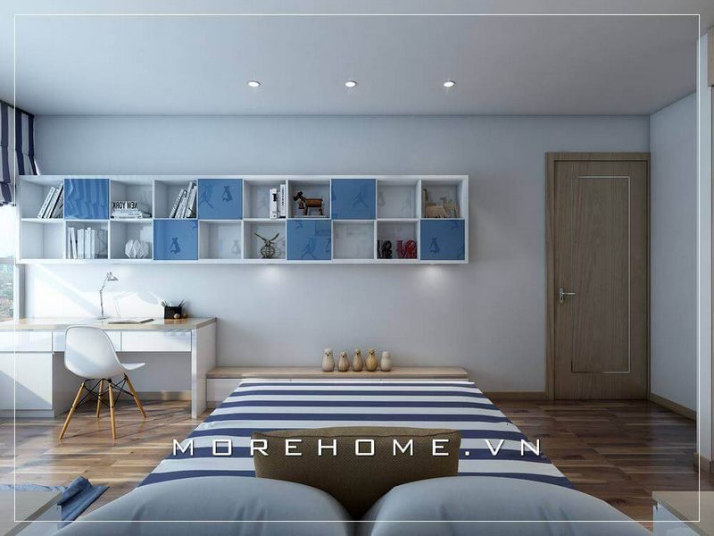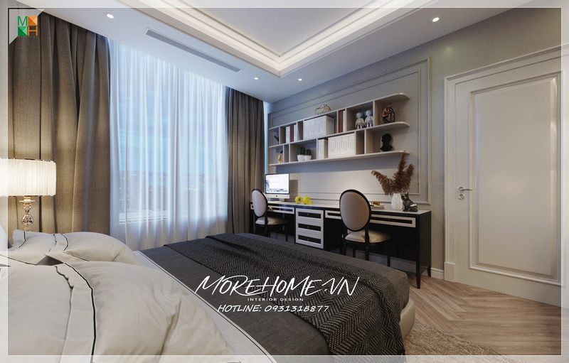 Trong phòng ngủ cũng được chú trọng đến không gian học tập nên đã được các kiến trúc sư Morehome thiết kế mẫu bàn làm việc từ gỗ với hai màu đen và trắng kết hợp hiện đại.