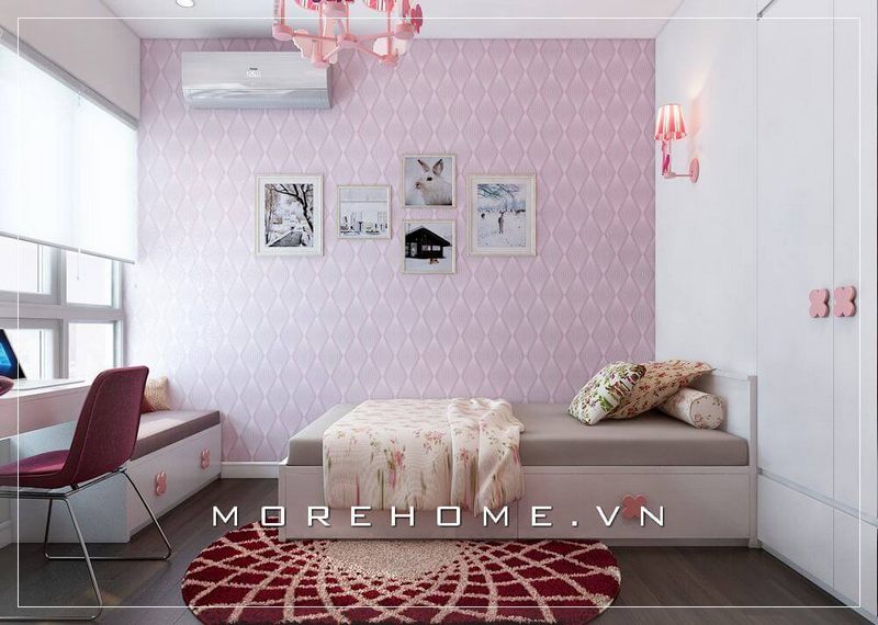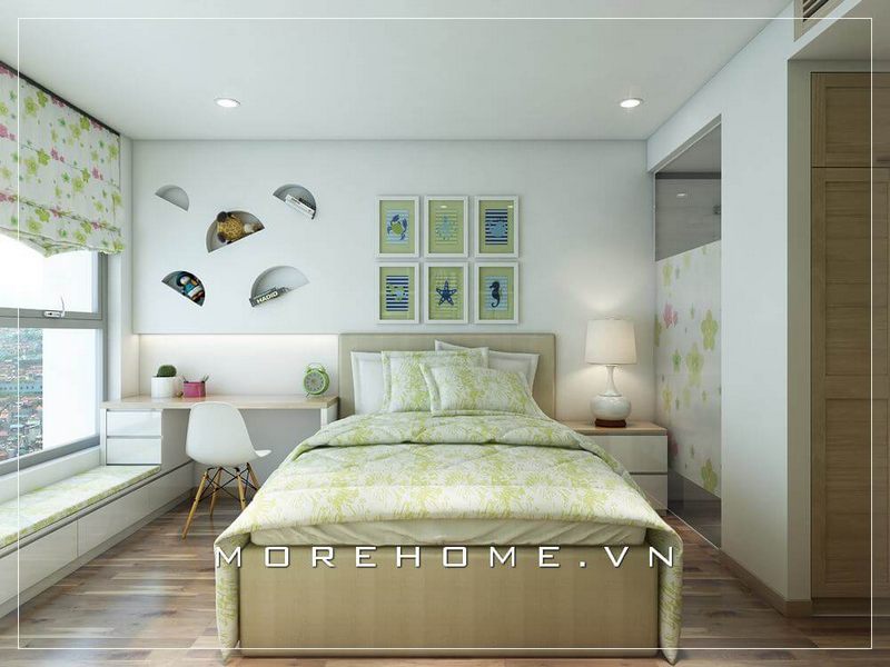 bàn làm việc gỗ công nghiệp hiện đại được thiết kế ngay tại khu vực cửa sổ căn phòng giúp con sử dụng được thêm ánh sáng tự nhiên và tập tập hơn trong không gian học tập