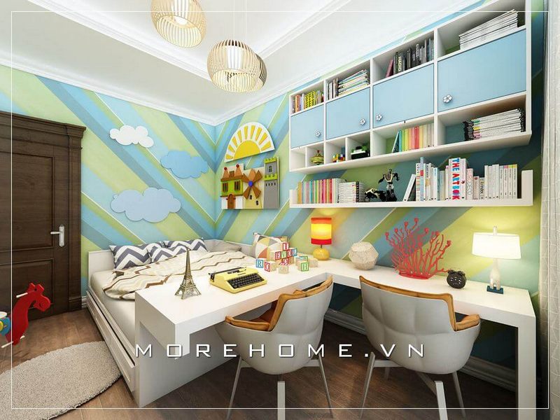 Bàn học của con được thiết kế hiện đại đặt ngay cạnh cửa sổ, giá sách treo ngay trên bàn học, giúp trí tưởng tượng bay cao, giúp bé có tư duy tốt hơn.