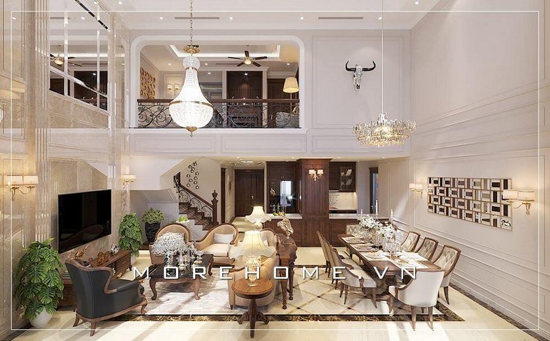 Kiến trúc sư đã thiết kế phòng bếp biệt thự, nhà phố tân cổ điển với bàn đảo làm từ gỗ óc chó nâu vân sang trọng, mặt đá đen tinh tế, độc lập với các nội thất khác trong căn phòng.