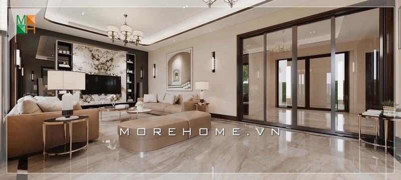 Tạo ra một không gian sang trọng, hiện đại trong phòng khách của biệt thự bằng cách sử dụng bộ sofa văng da chạy dài để tạo ấn tượng.